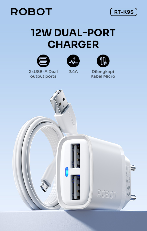 - Robot Charger RT-K9S 2.4A, pengisian cepat dan stabil untuk smartphone dan tablet.