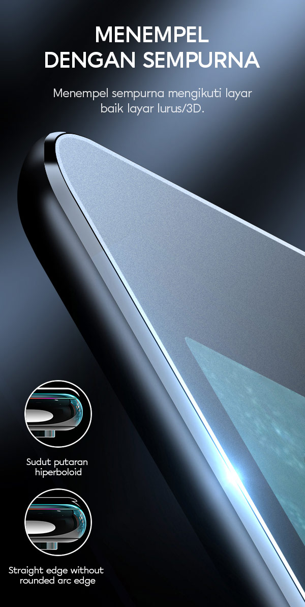 - Perlindungan layar full cover yang lentur dan tahan lama, cocok untuk semua tipe smartphone dengan layar datar maupun lengkung.