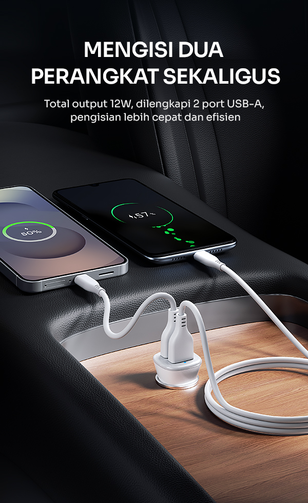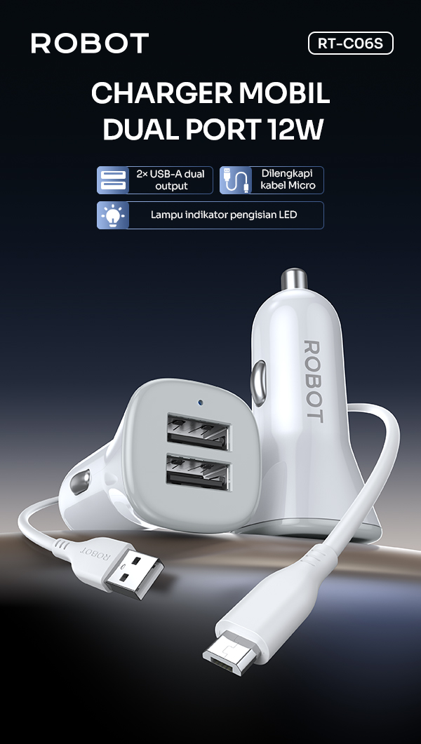 - Charger mobil ROBOT RT-C06S dengan dual port USB yang memungkinkan pengisian dua perangkat sekaligus secara praktis.