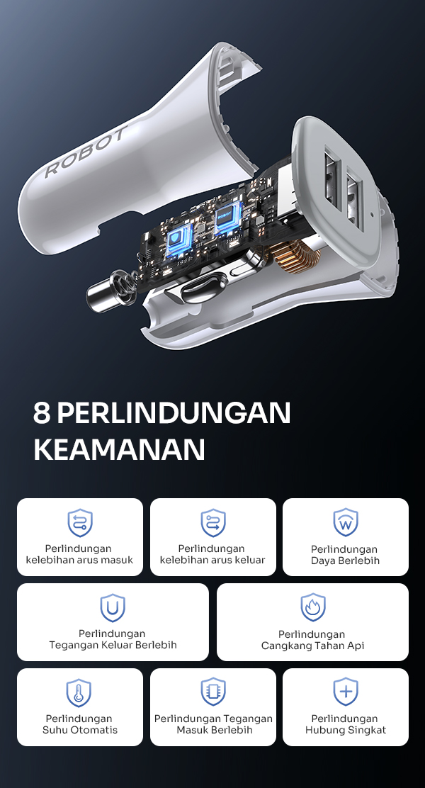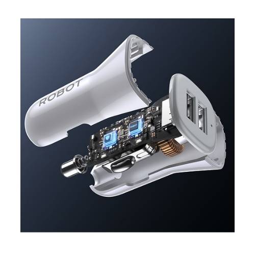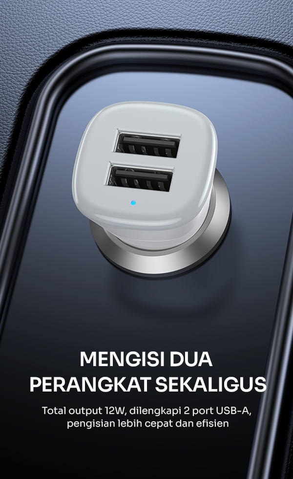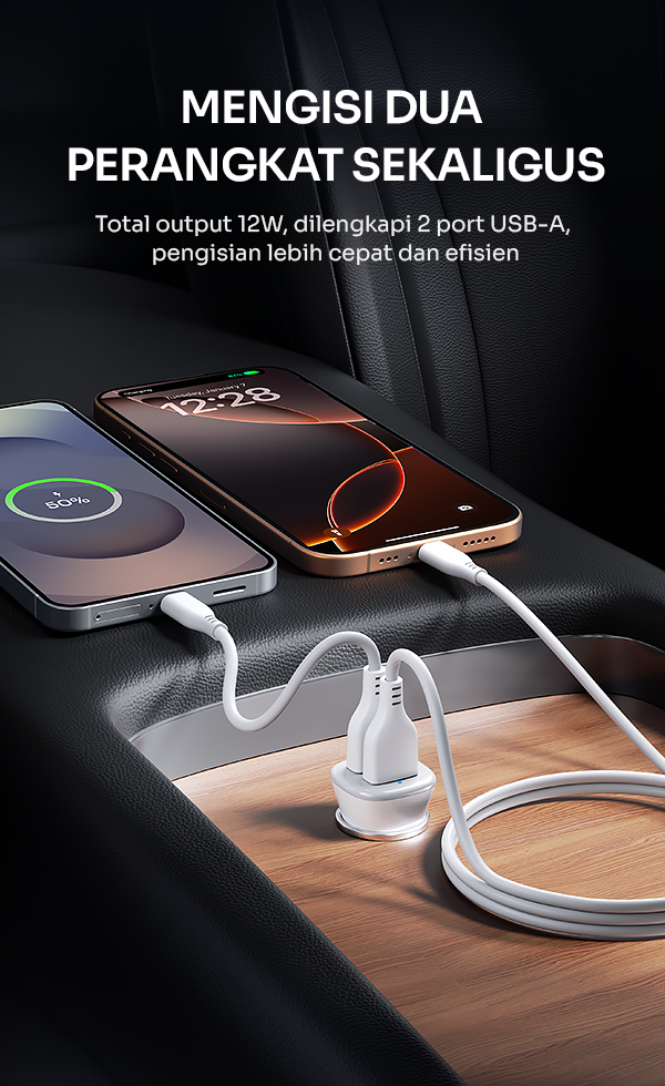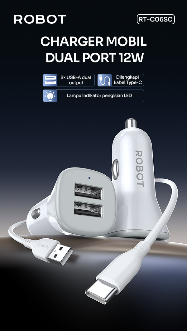 - Charger mobil ROBOT RT-C06SC dengan total daya 12W yang mampu mengisi daya perangkat secara cepat dan stabil saat berkendara.