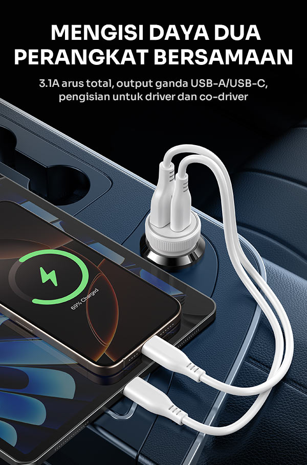 - Mendukung pengisian simultan dua perangkat dengan teknologi smart IC untuk distribusi daya optimal dan efisien.