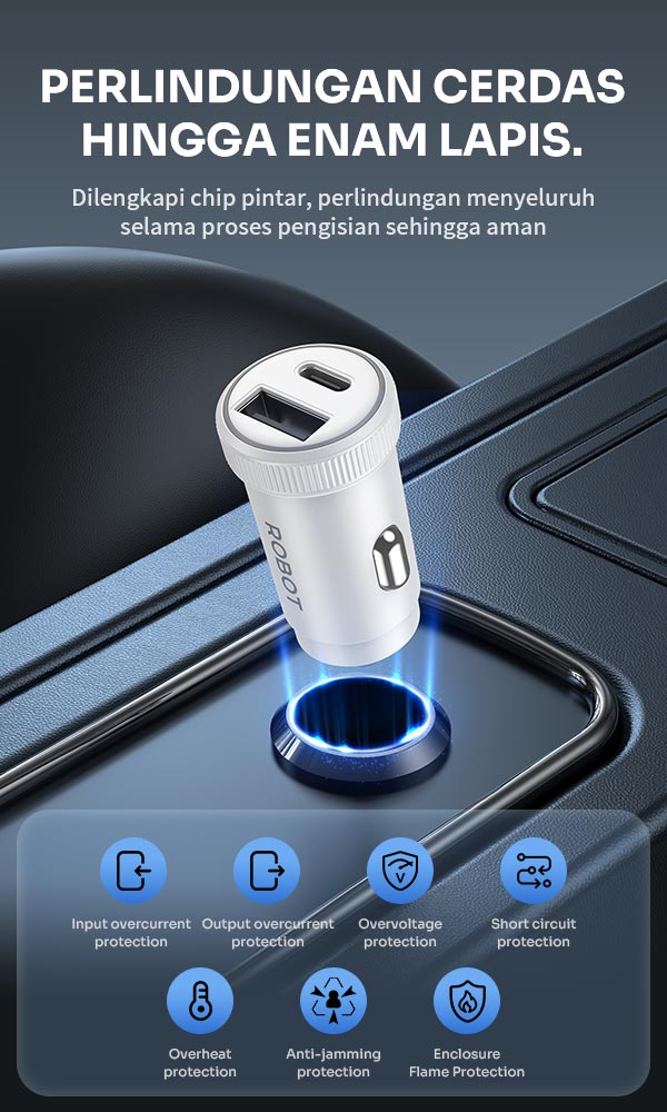 Rp 48.500- Charger Robot Saver Mobil RT-CC6 dengan dual port USB-A dan USB-C, mendukung pengisian cepat dengan output total hingga 35W Power Delivery (PD).