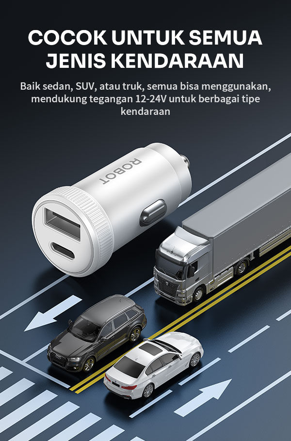 - Charger Robot Saver Mobil RT-C13 dengan dual port USB-A dan USB-C, output total 3.1A untuk pengisian dua perangkat secara bersamaan.