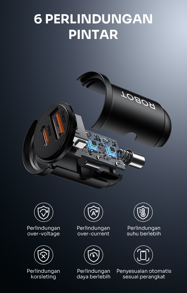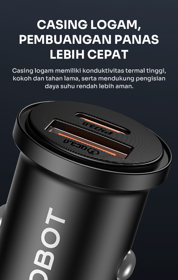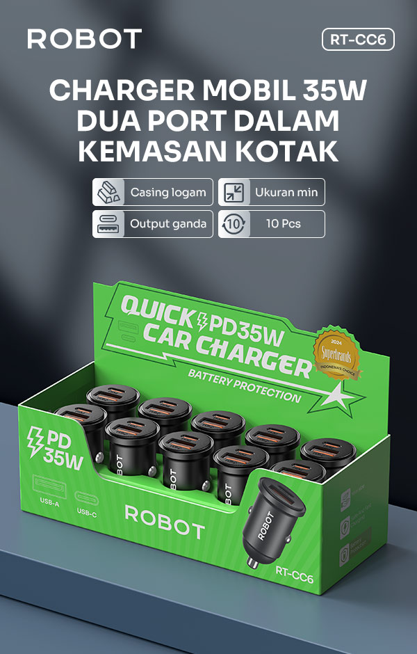 - Charger Robot Saver Mobil RT-CC6 dengan dual port USB-A dan USB-C, mendukung pengisian cepat dengan output total hingga 35W Power Delivery (PD).
