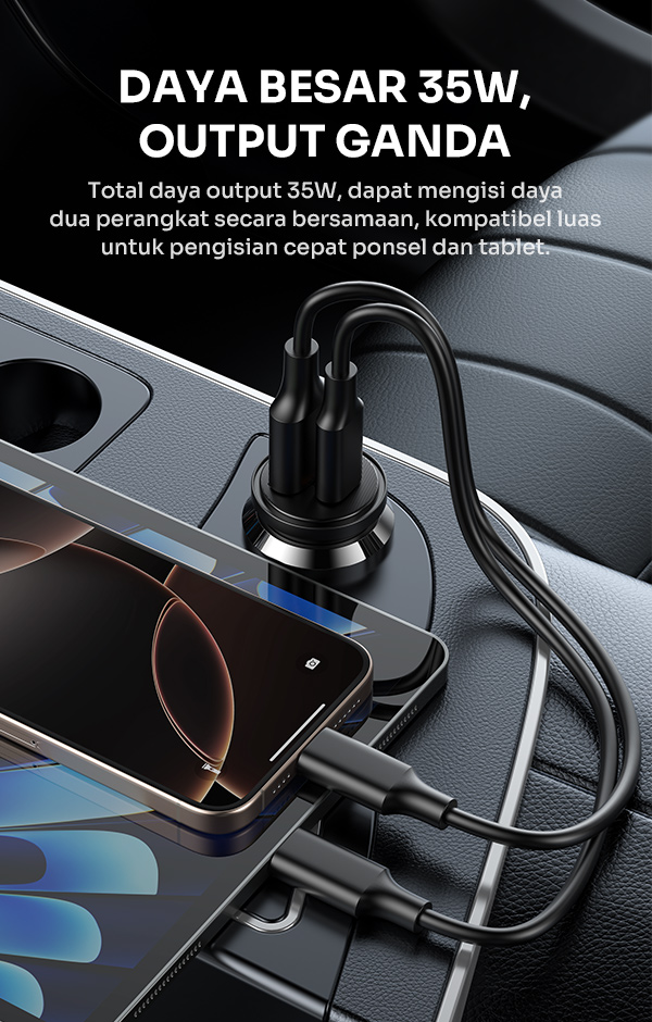 - Mendukung pengisian simultan dua perangkat dengan teknologi smart IC untuk distribusi daya optimal dan efisien.