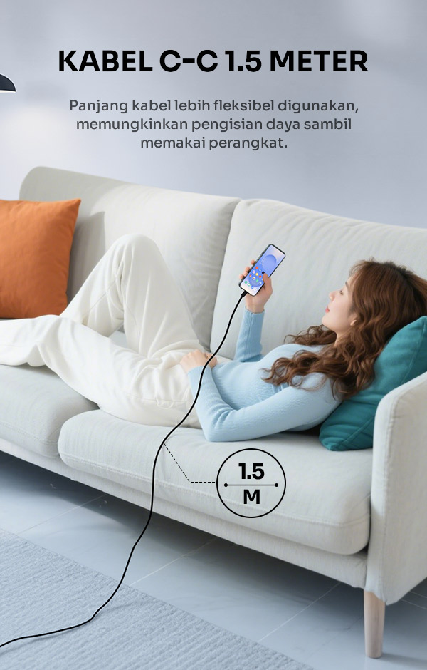 - Termasuk kabel USB-C to USB-C sepanjang 1,5 meter untuk kenyamanan dan fleksibilitas saat pengisian.