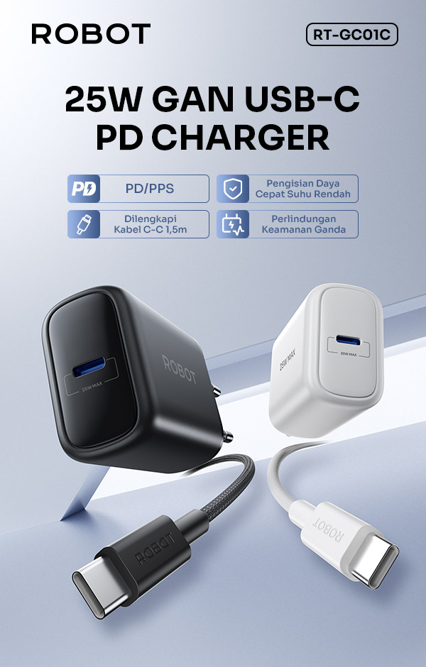 - Charger Robot RT-GC01C dengan teknologi GaN 30W, menawarkan efisiensi tinggi, suhu lebih rendah, dan pengisian cepat untuk berbagai perangkat.