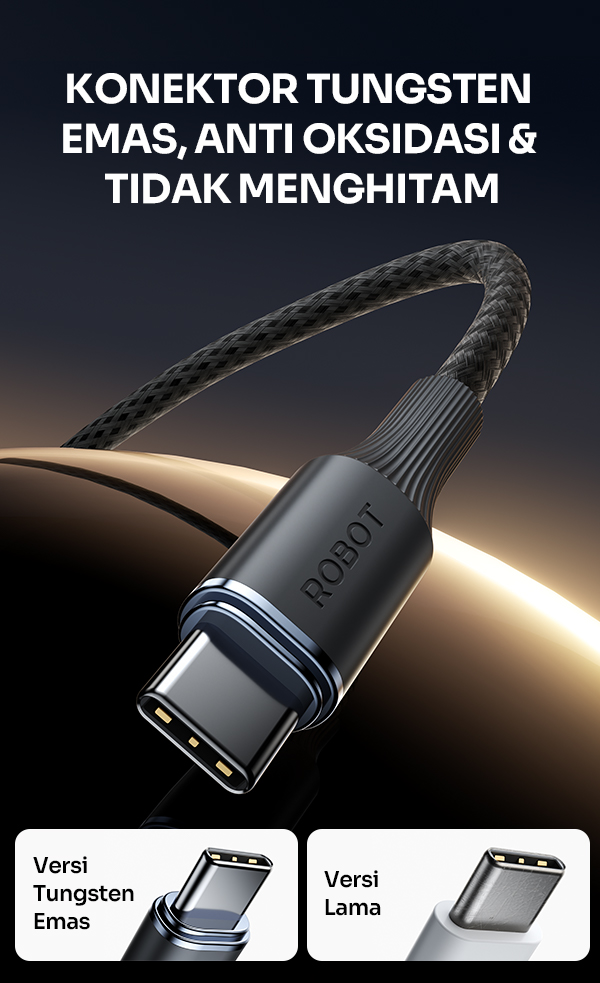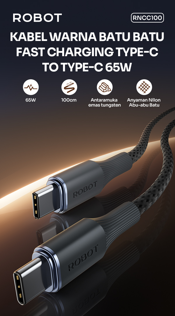 - Kabel Data ROBOT RNCC100 LAVA DATA mendukung fast charging hingga 65W sehingga cocok untuk pengisian daya smartphone, tablet, hingga laptop USB Type-C.