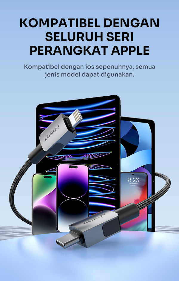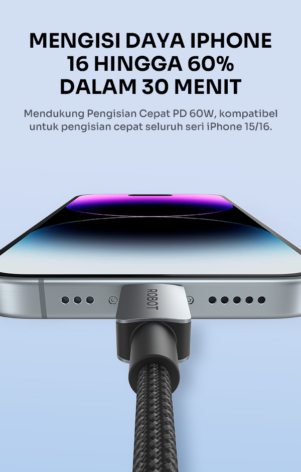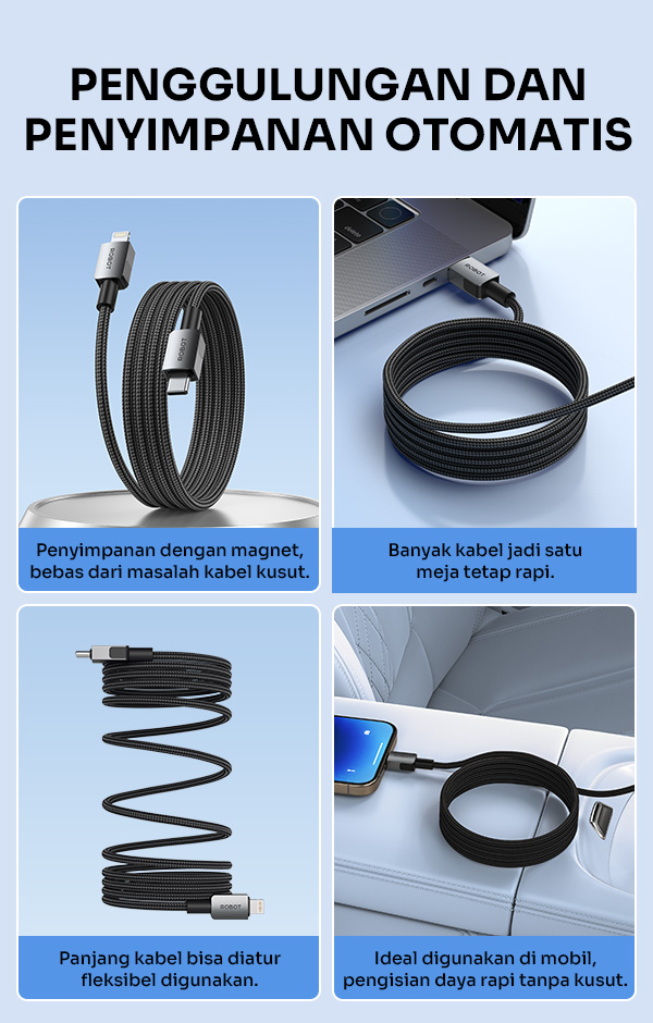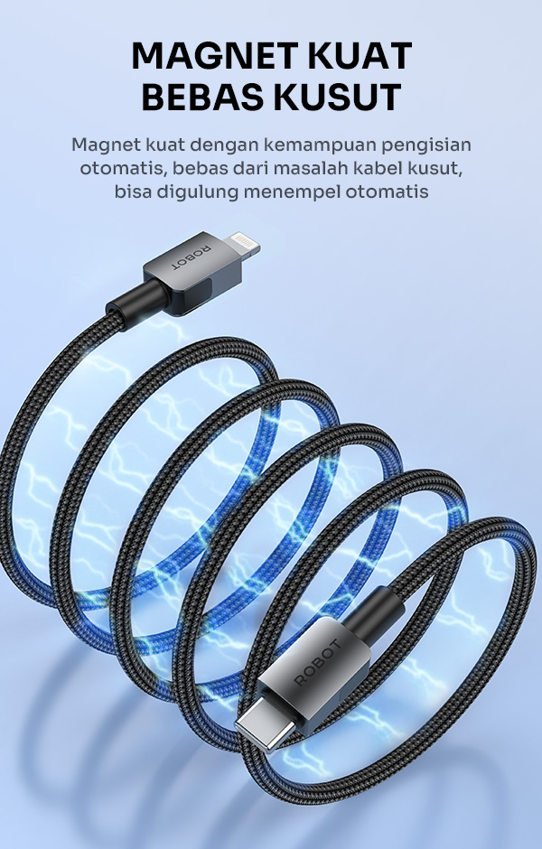 - Kabel Data ROBOT RXCL100 Creative Magnetic Type-C to Lightning dengan dukungan fast charging hingga 27W (3A) untuk pengisian iPhone lebih cepat.