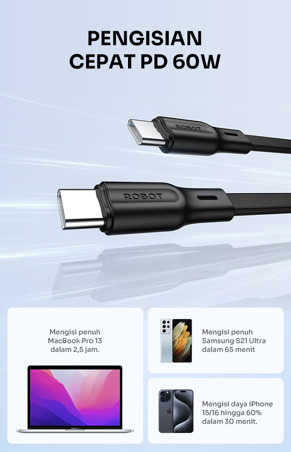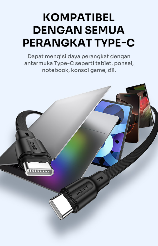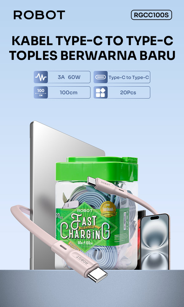 - Kabel Data Robot RGCC100S dengan kapasitas arus hingga 3A dan daya maksimal 60W, mendukung fast charging untuk smartphone dan laptop.