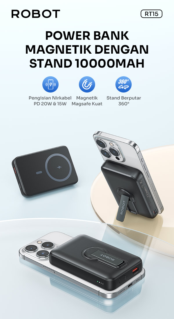 - Power Bank Robot RT15 dengan kapasitas 10.000mAh, mampu mengisi daya smartphone hingga beberapa kali dalam satu pengisian penuh.
