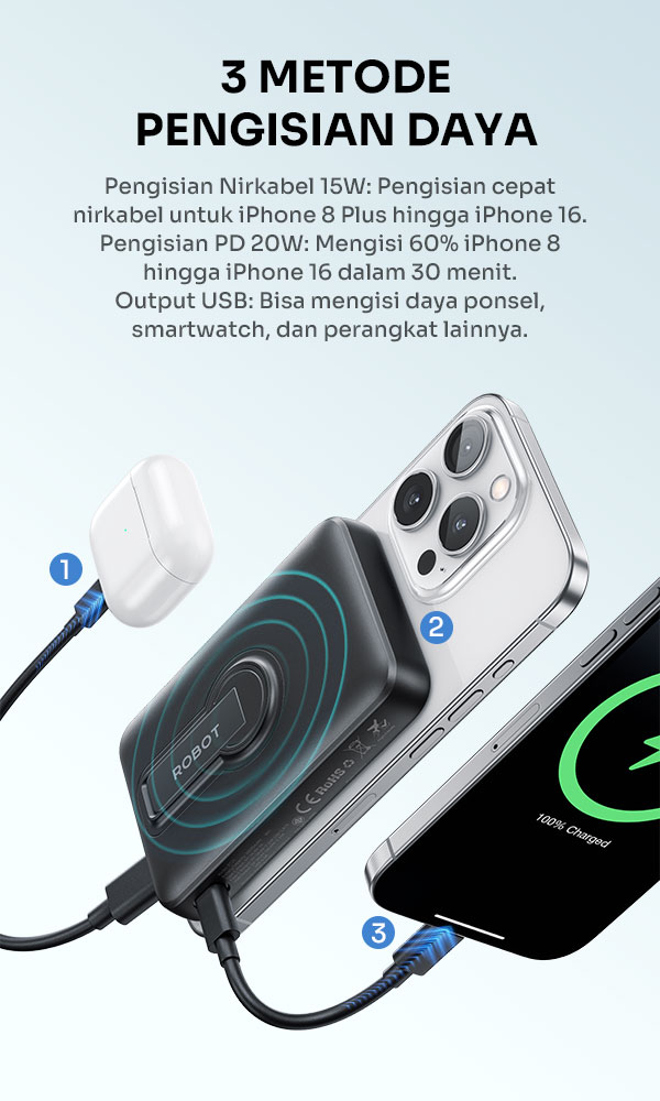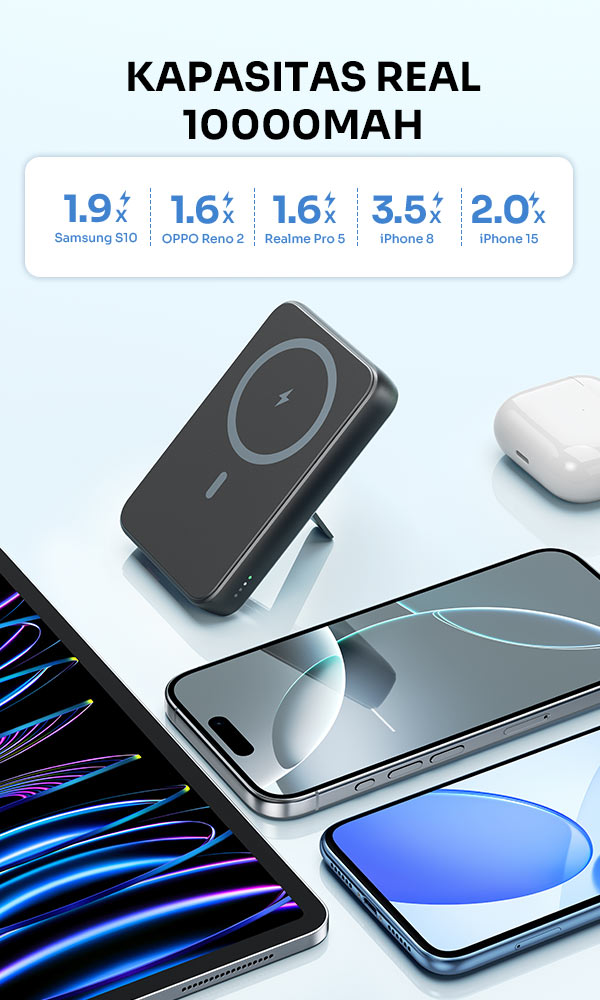 - Kompatibel dengan iPhone seri MagSafe (iPhone 12 ke atas), case magnetik kompatibel, serta perangkat USB-C seperti Android, tablet, dan TWS.