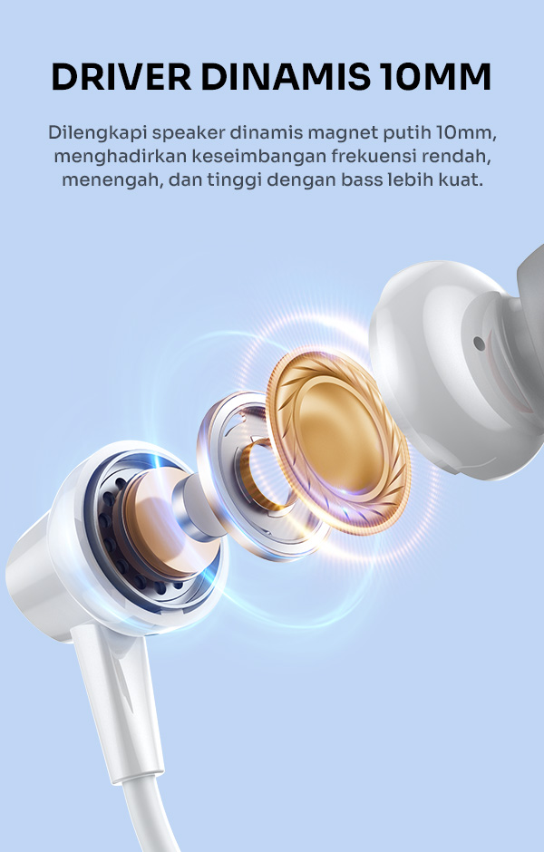 - Speaker Dynamic 10MM dengan Copper Ring memberikan audio berkualitas tinggi dan detail.