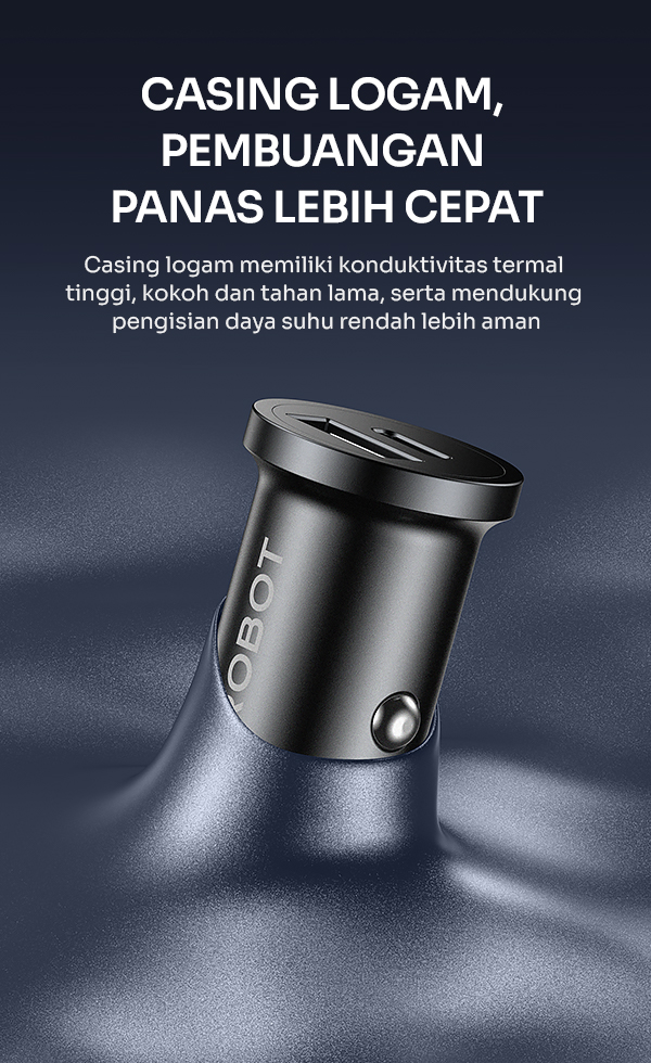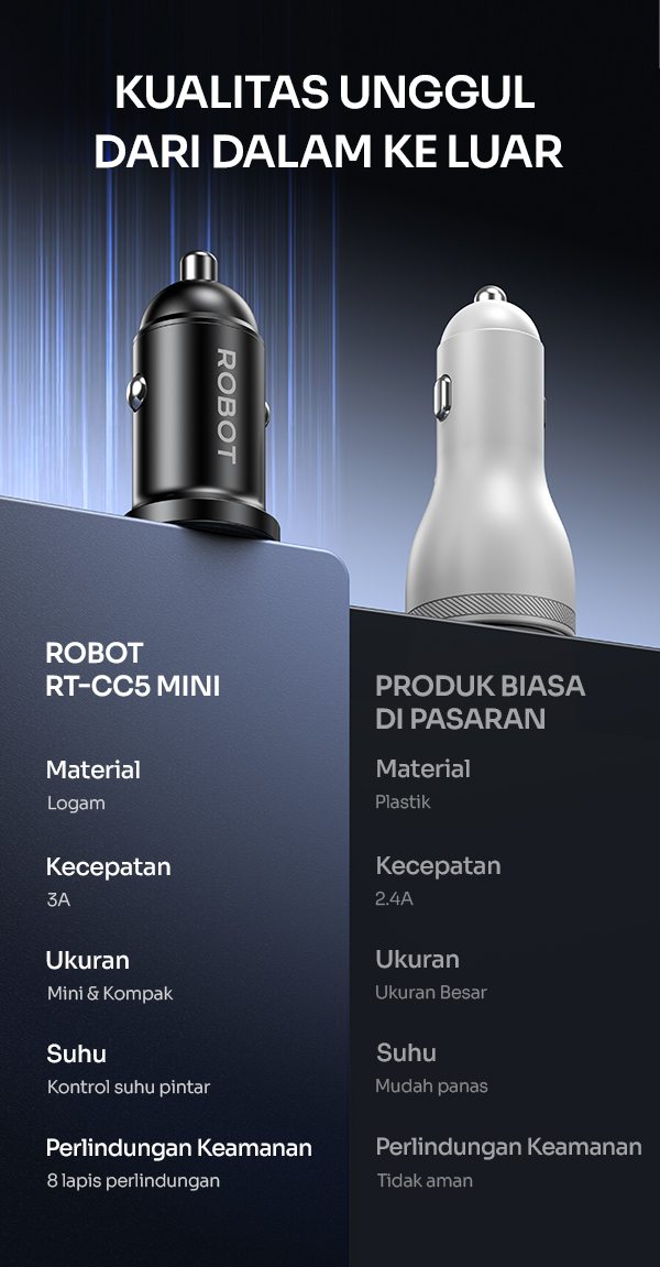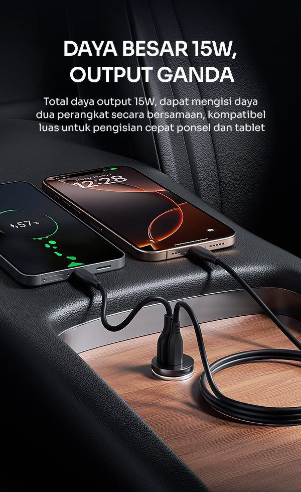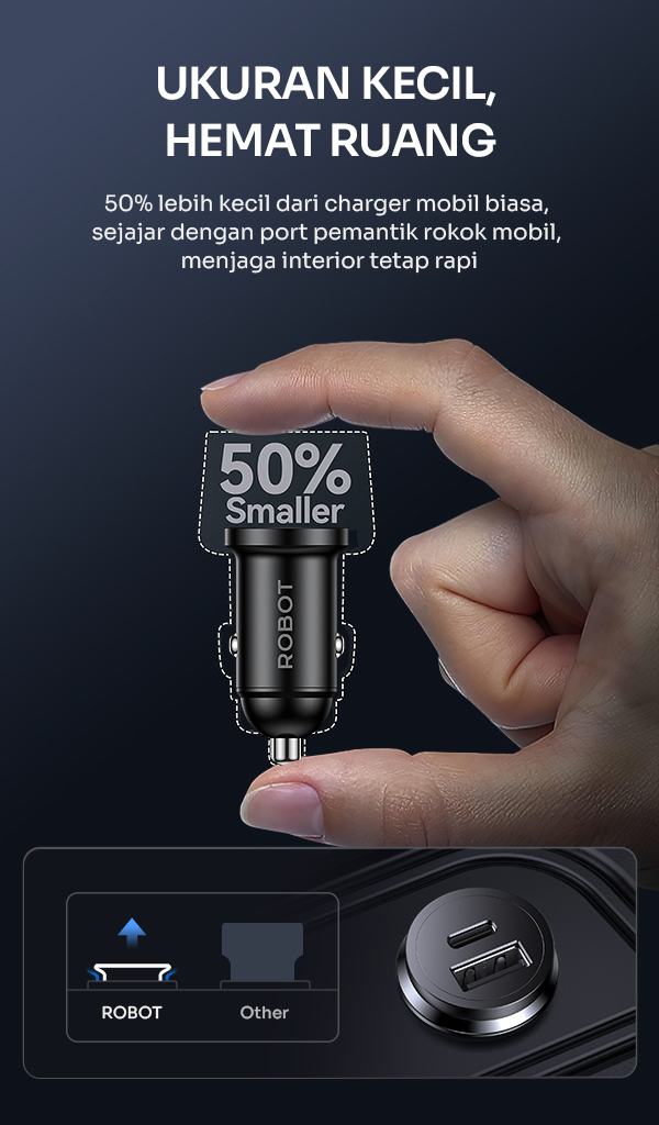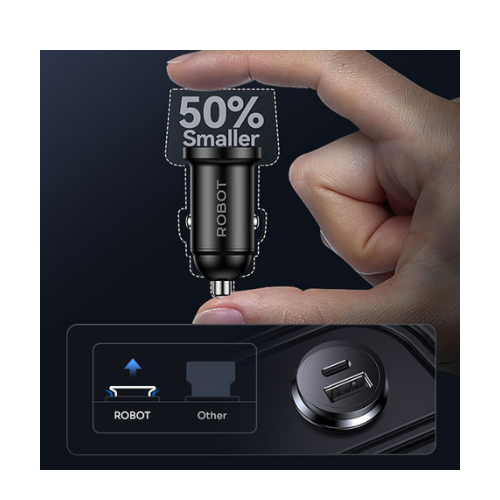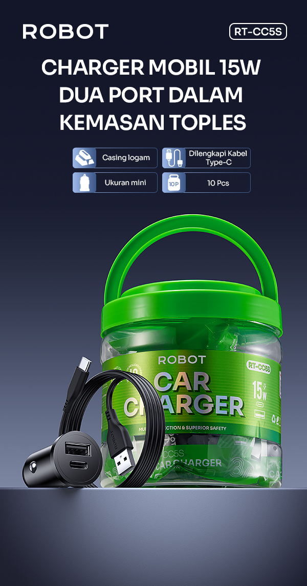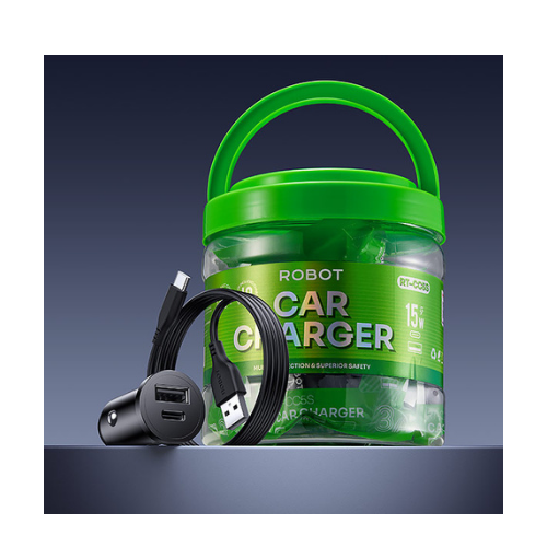 - Charger mobil Robot RT-CC5S dengan output total 15W, mampu mengisi dua perangkat sekaligus melalui 2 port USB.
