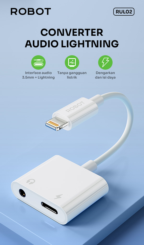 - Robot Data Cable RUL02 2in1 Lightning ke Jack Audio 3.5mm, mendukung audio jernih dan pengisian daya simultan.