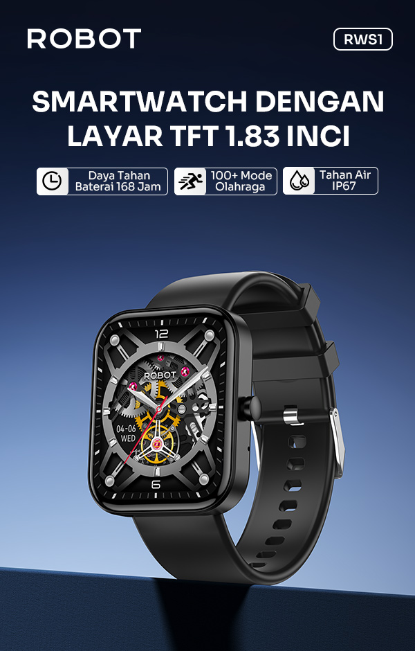 Rp 179.000- Smart Watch ROBOT RWS2 dengan layar IPS 1,83 inci yang luas dan jernih untuk tampilan informasi lebih nyaman.