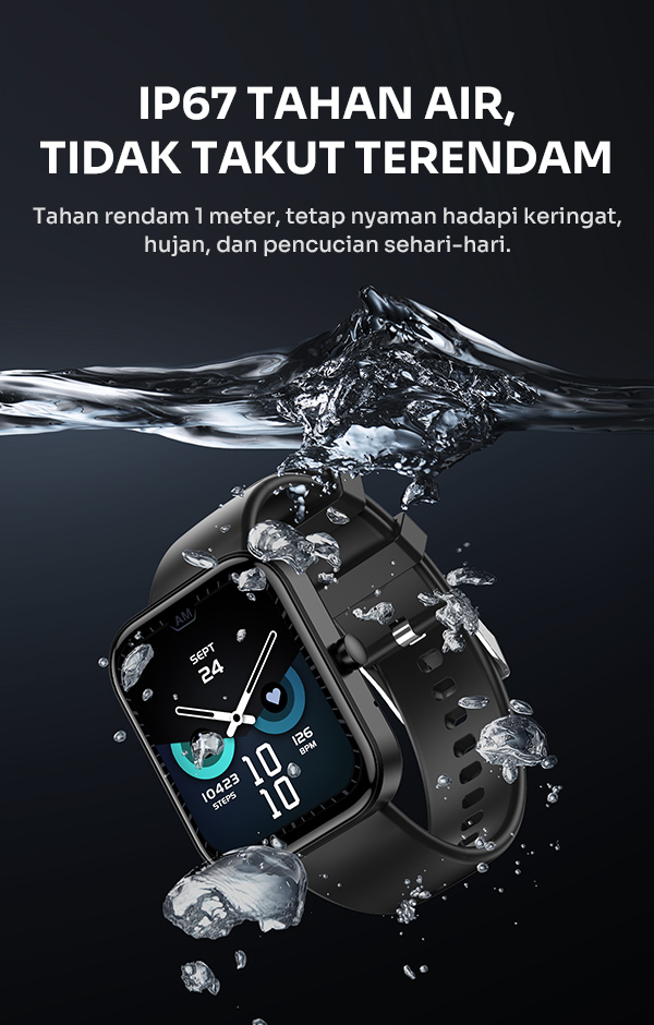 - Memiliki sertifikasi IP67 yang membuat smartwatch tahan terhadap debu serta percikan air dalam penggunaan sehari-hari.