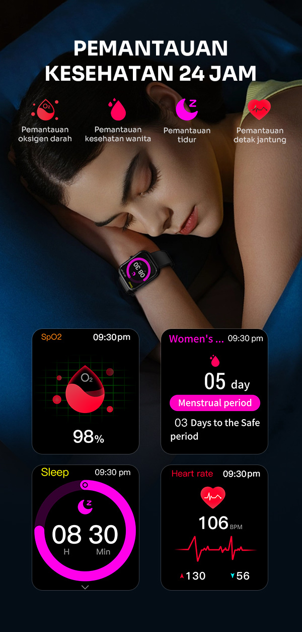 - Fitur pemantauan kesehatan seperti detak jantung, langkah kaki, kalori, dan kualitas tidur.