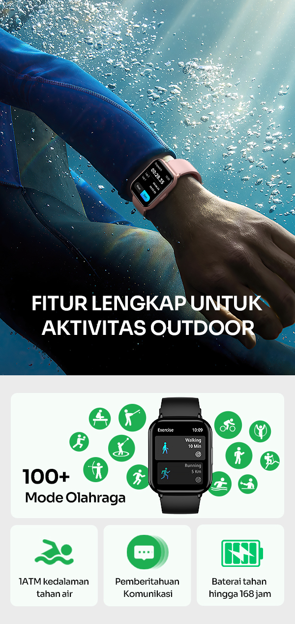 - Mendukung berbagai mode olahraga untuk memantau performa aktivitas Anda.