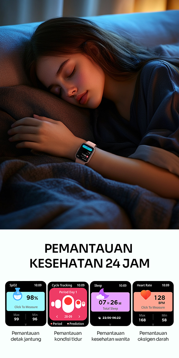 - Fitur pemantauan kesehatan seperti detak jantung, langkah kaki, kalori, dan kualitas tidur.