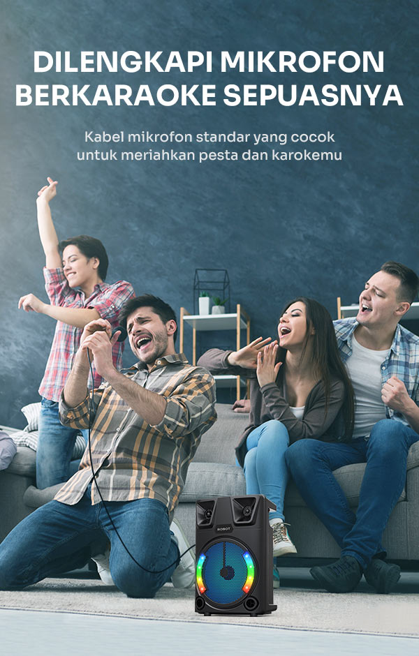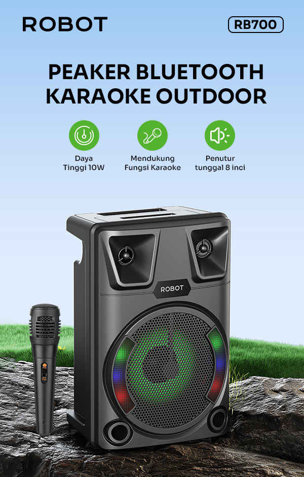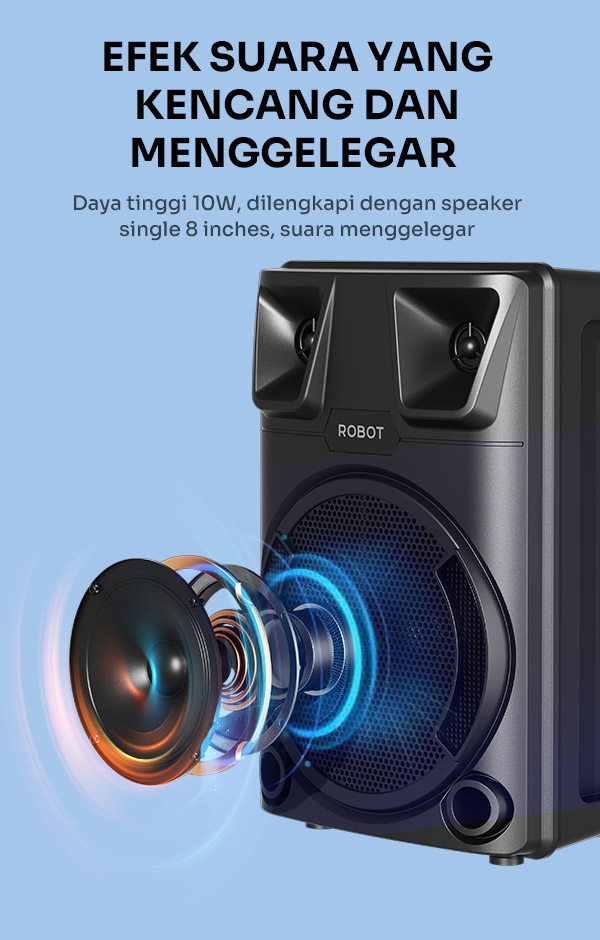 - ROBOT RB700 Karaoke Speaker dengan woofer 8 inci, menghasilkan suara lebih besar, bass kuat, dan vokal yang jernih.