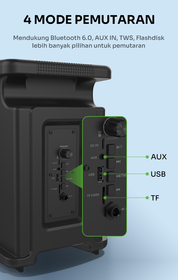 - Mendukung berbagai input seperti Bluetooth, USB, dan Micro SD untuk fleksibilitas pemutaran musik.