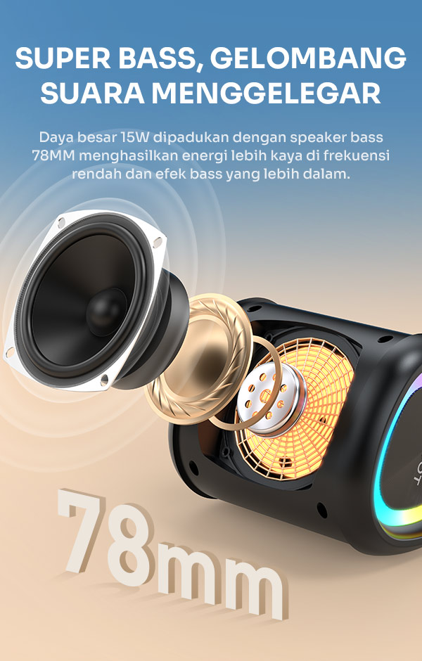 - Output power 3W dengan driver speaker 40mm, menghasilkan bass kuat dan frekuensi respons 100Hz–18KHz yang seimbang.