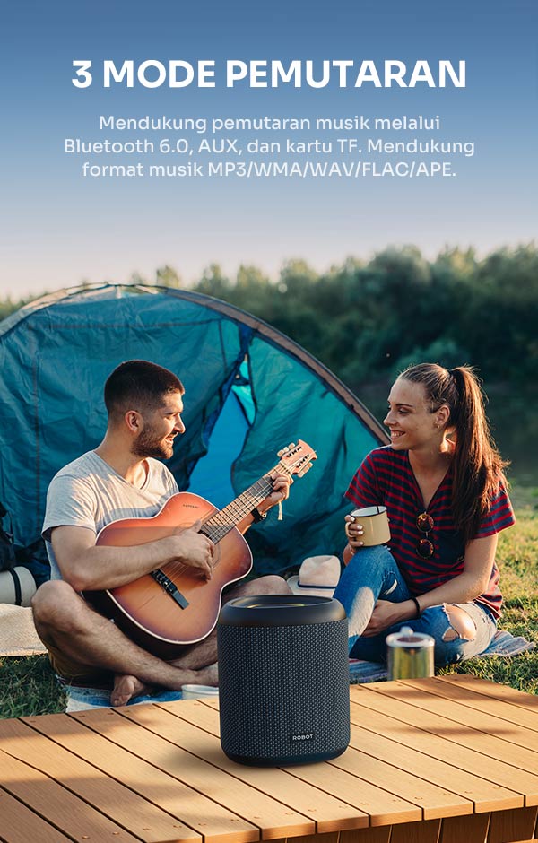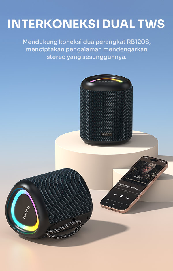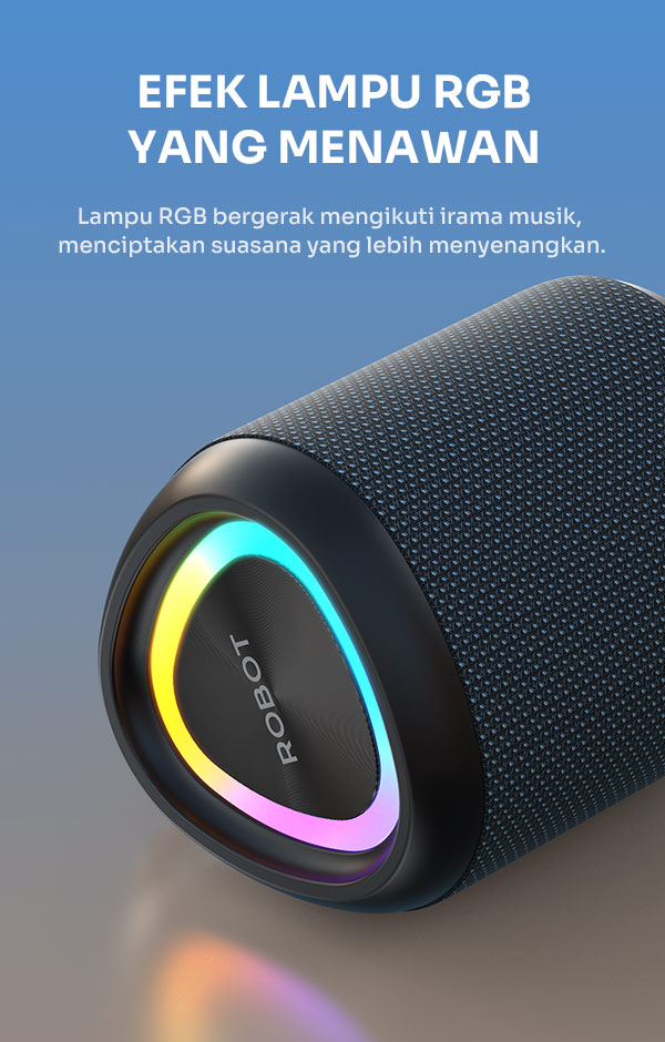 - ROBOT RB120 Bluetooth Speaker dengan RGB Lights dinamis, menghadirkan efek cahaya keren yang menambah suasana lebih hidup.