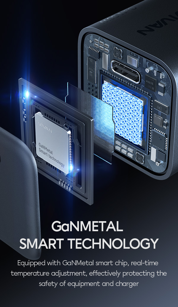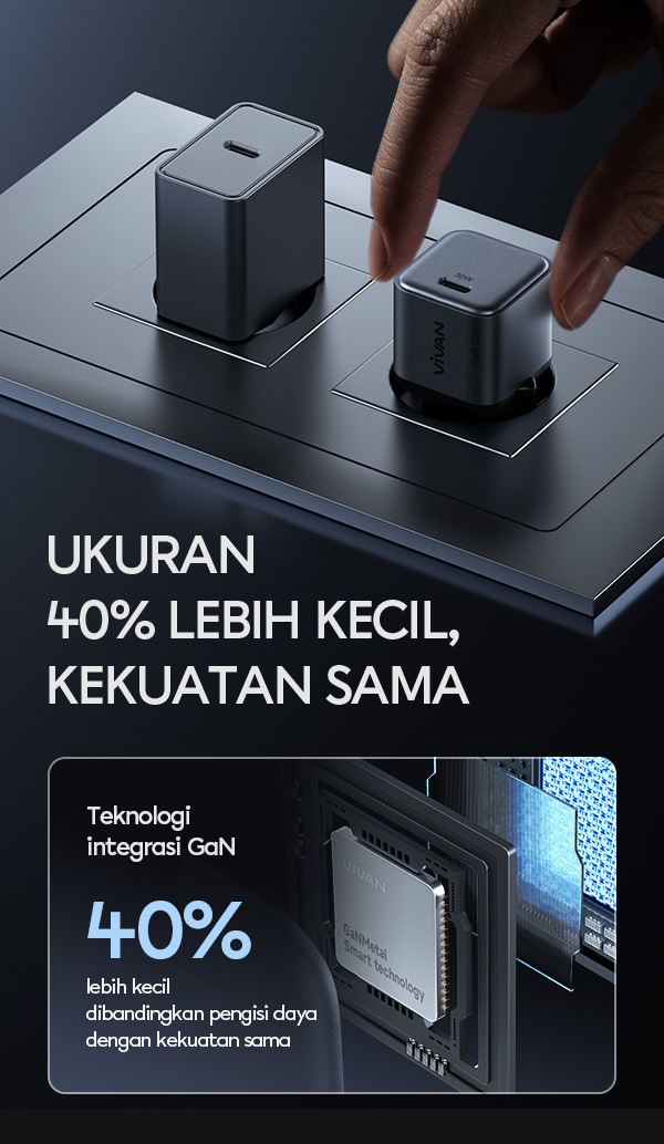 - Teknologi GaN Metal terbaru dengan ukuran ultra-kompak dan tahan panas untuk pengisian yang lebih efisien dan aman.