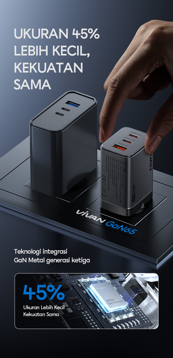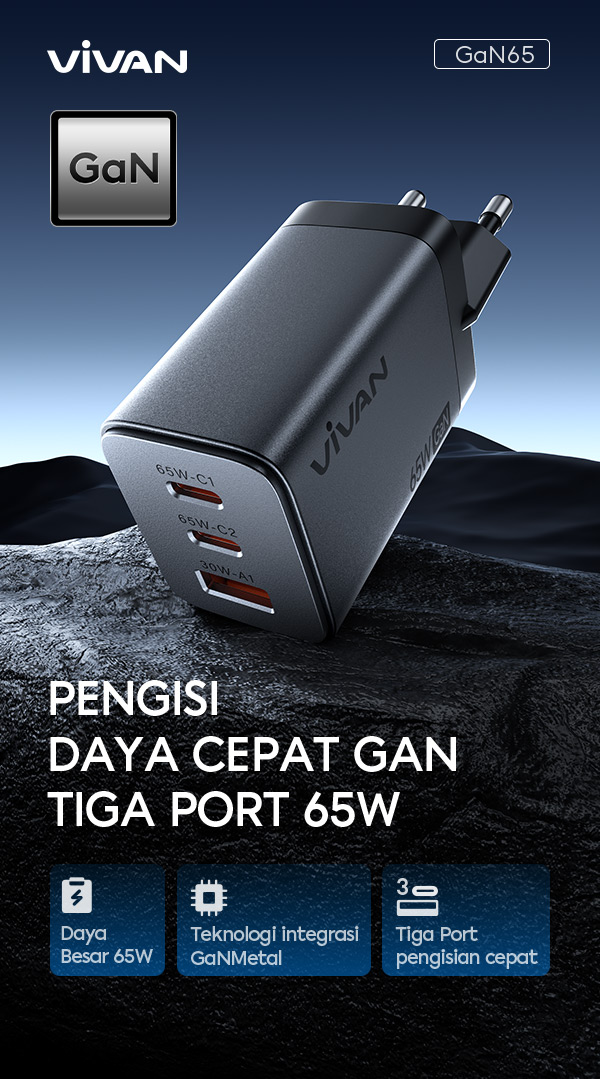 - Adaptor VIVAN GaN65 Silvery dengan daya besar hingga 65W, mendukung pengisian cepat dan efisien untuk berbagai perangkat.