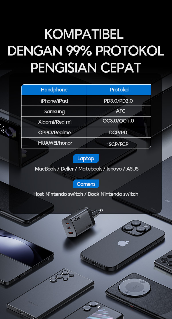 - Kompatibel dengan berbagai protokol fast charging populer, memastikan pengisian yang optimal dan aman.