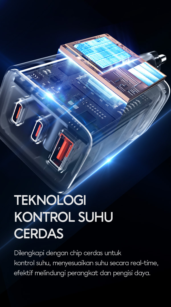 - Teknologi GaN (Gallium Nitride) canggih, membuat charger lebih kecil, efisien, dan tahan panas.