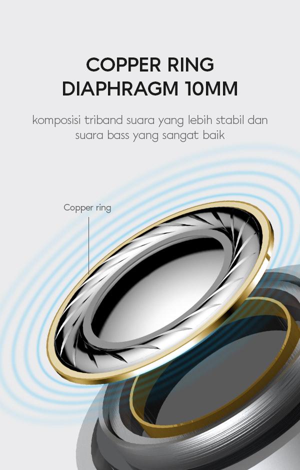 - Speaker Dynamic 10MM dengan Copper Ring memberikan audio berkualitas tinggi dan detail.