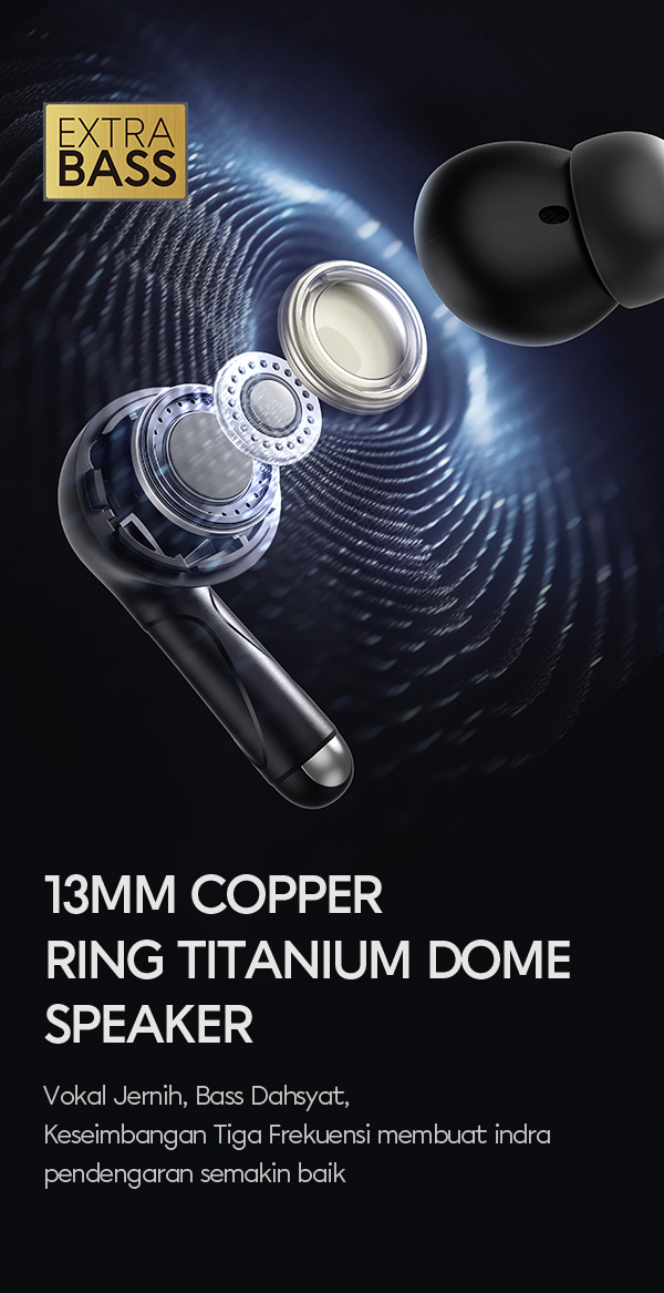 - Speaker 13mm berlapis titanium dengan tuning Ultra Bass.