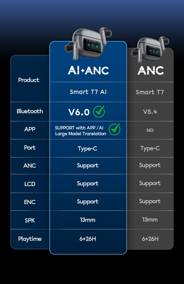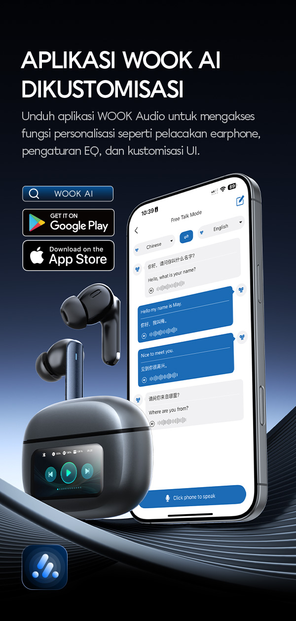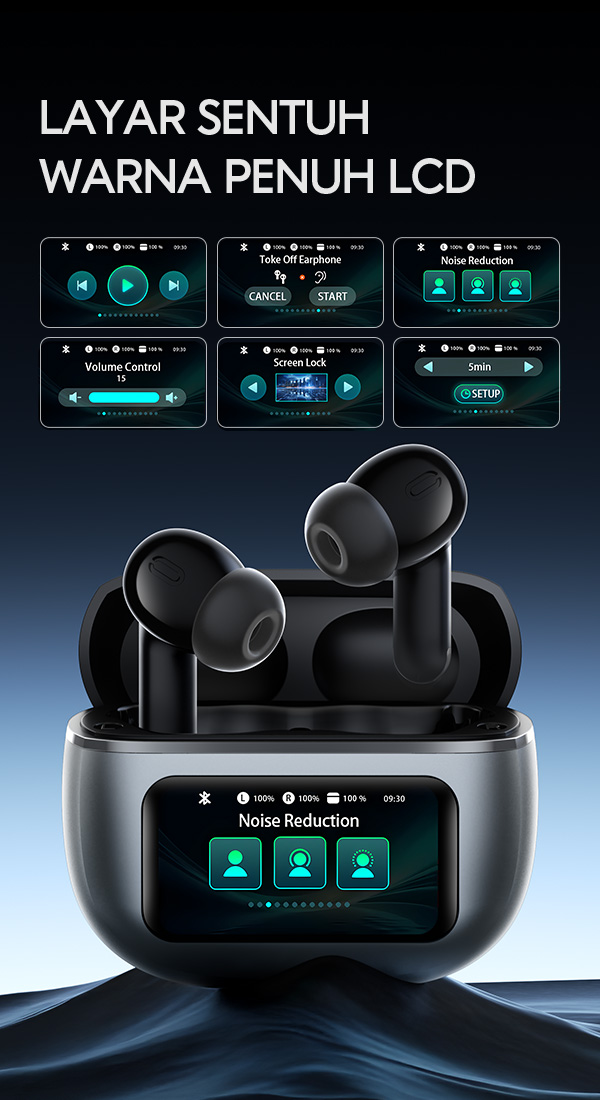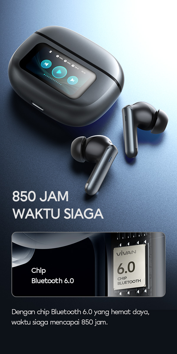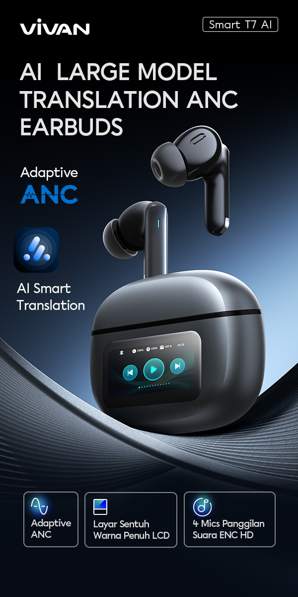 - Vivan Wireless Smart T7 AI hadir dengan LCD Smart Touchscreen pada charging case untuk kontrol fitur lebih mudah dan modern.