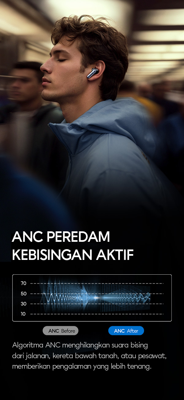 - Teknologi Adaptive ANC otomatis menyesuaikan tingkat peredaman suara sesuai lingkungan, membuat fokus tetap maksimal di mana pun kamu berada.