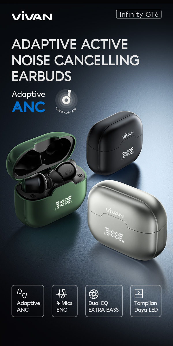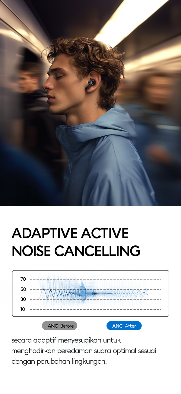 - Teknologi Adaptive ANC otomatis menyesuaikan tingkat peredaman suara sesuai lingkungan, membuat fokus tetap maksimal di mana pun kamu berada.