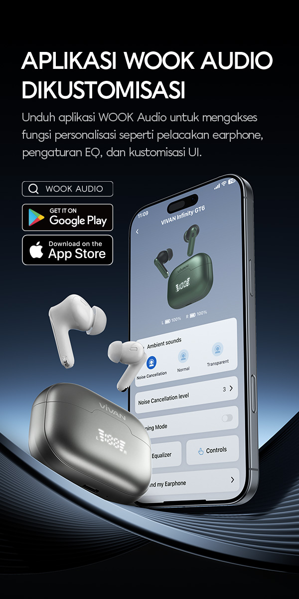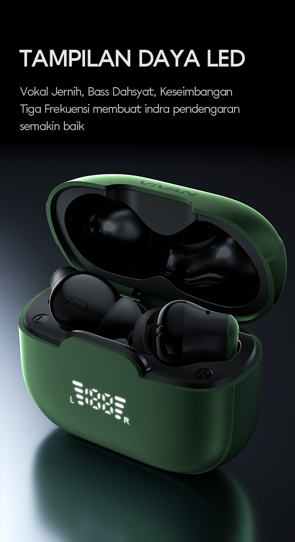 - Vivan Wireless Smart T7 AI hadir dengan LCD Smart Touchscreen pada charging case untuk kontrol fitur lebih mudah dan modern.