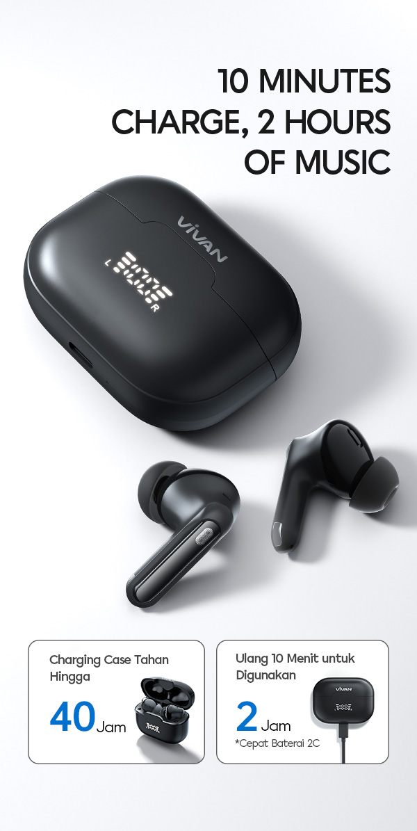 - Super hemat daya! Charging case mampu bertahan hingga 40 jam, cukup isi ulang 10 menit untuk menikmati musik selama 2 jam nonstop.