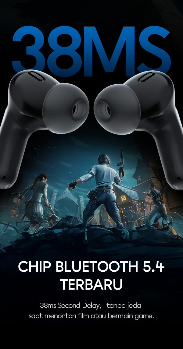- Chip Bluetooth 5.4 terbaru dengan latensi ultra rendah 38ms untuk pengalaman bermain game dan menonton film tanpa jeda.