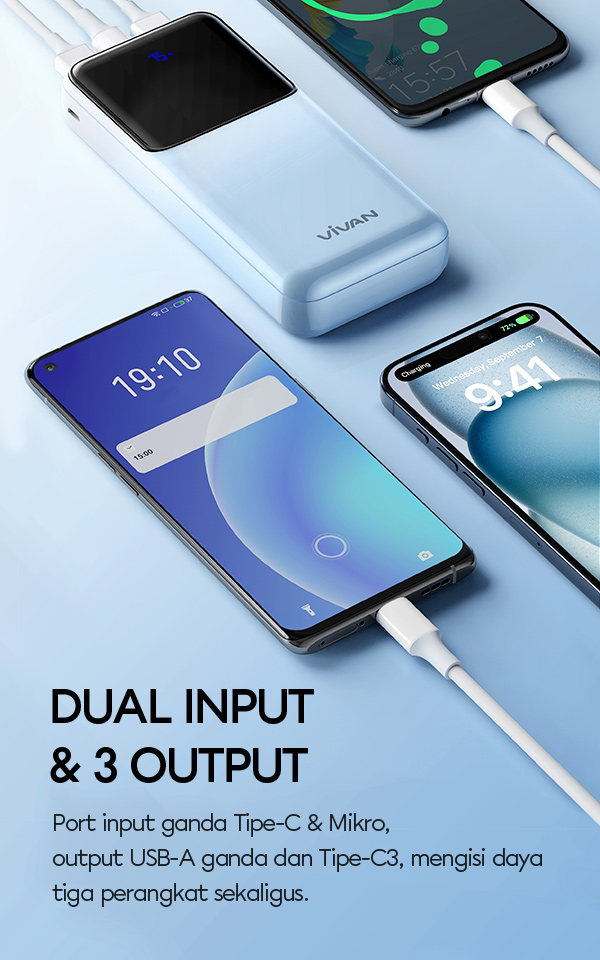 - Dual input (Micro USB & Type-C) serta tiga output (2× USB-A + 1× Type-C) untuk mengisi hingga 3 perangkat sekaligus.