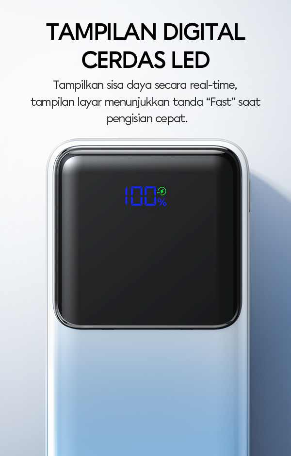 - Tampilan LED digital real-time menampilkan sisa daya baterai, memberi kemudahan dalam memantau kapasitas powerbank.