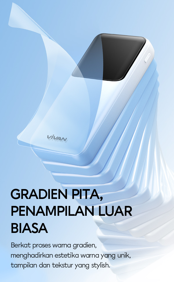 - Power Bank Vivan VPB D-20 kapasitas besar 20.000mAh, mampu mengisi beberapa perangkat berkali-kali dalam sekali pengisian penuh.