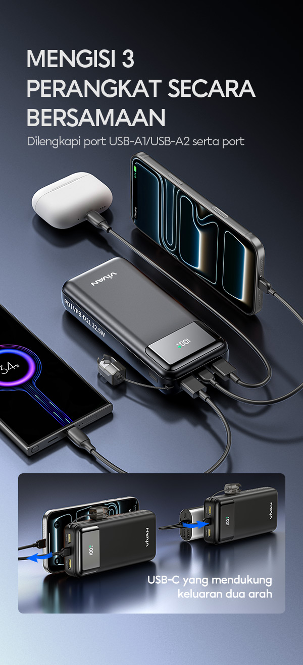 - Dual input (Micro USB & Type-C) serta tiga output (2× USB-A + 1× Type-C) untuk mengisi hingga 3 perangkat sekaligus.