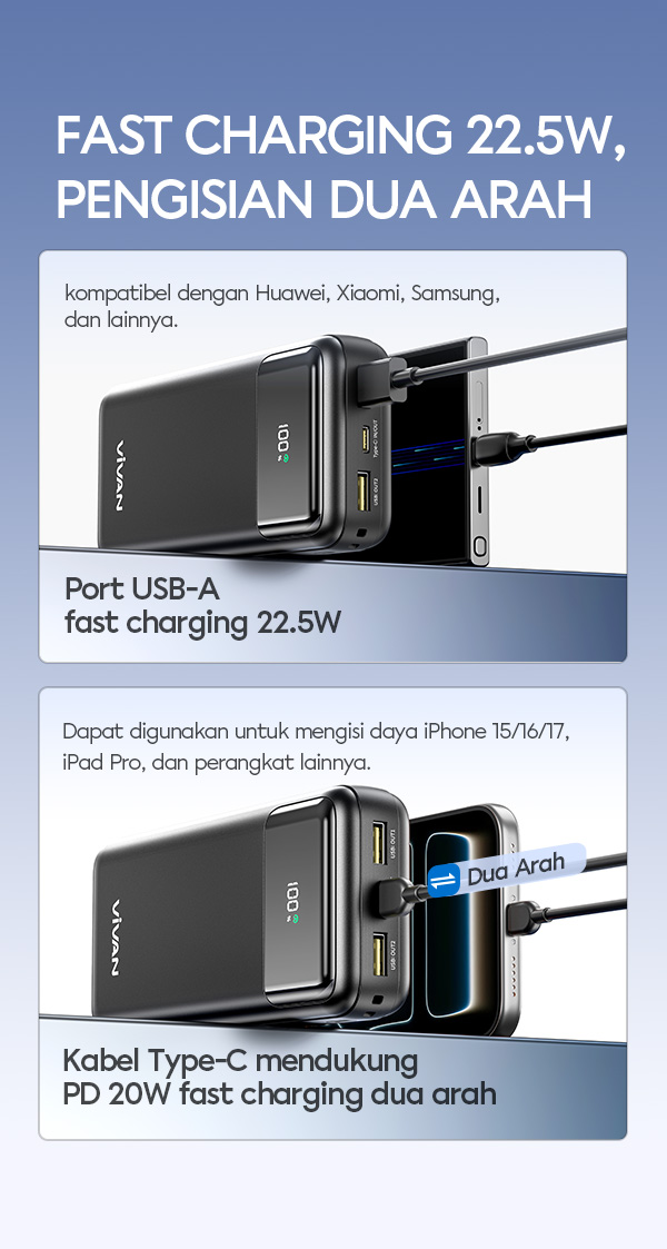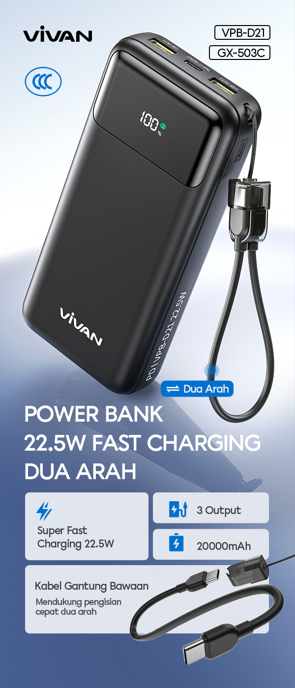 - Powerbank VIVAN D21 dengan kapasitas besar 20.000mAh, mampu mengisi daya smartphone berkali-kali dalam satu kali pengisian penuh.