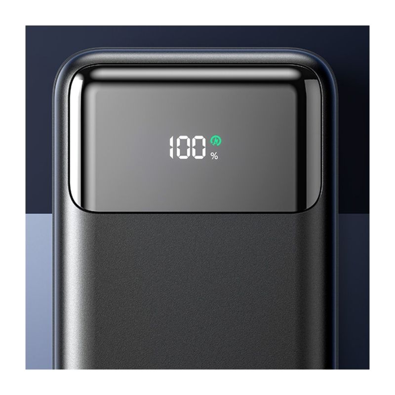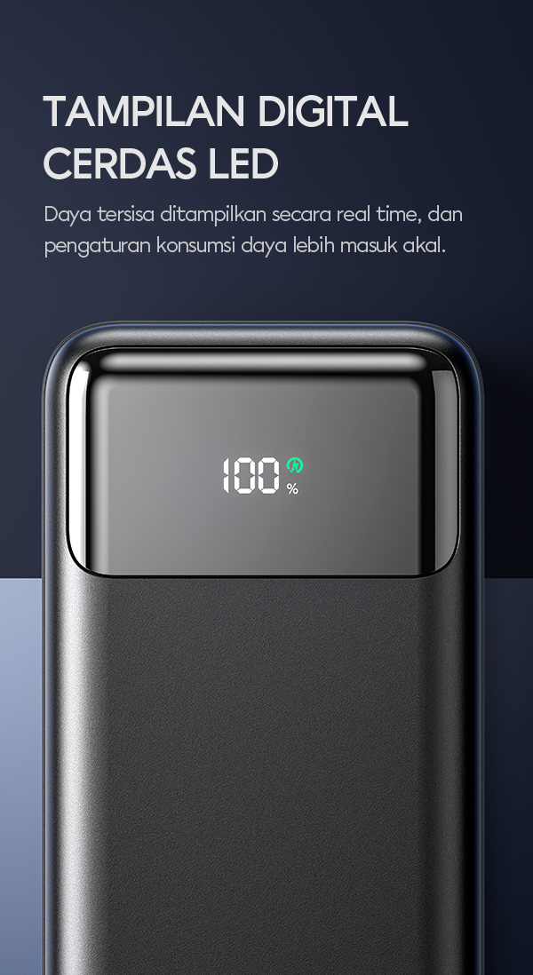 - Layar LED digital menampilkan kapasitas baterai dengan jelas serta notifikasi cepat saat pengisian powerbank (fast charging).