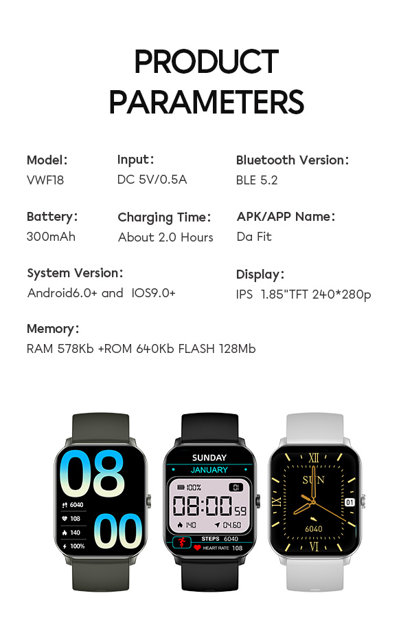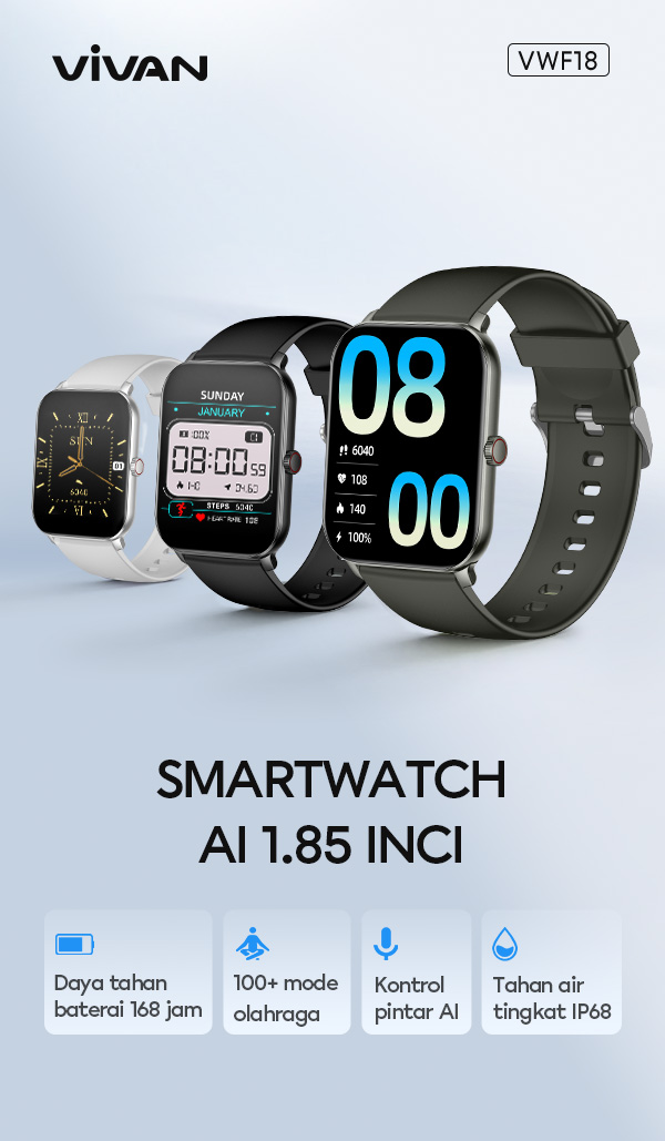 - Smart Watch VIVAN VWF18 dengan layar IPS 1.85 inci yang luas dan jernih, nyaman untuk melihat notifikasi dan menu harian.
