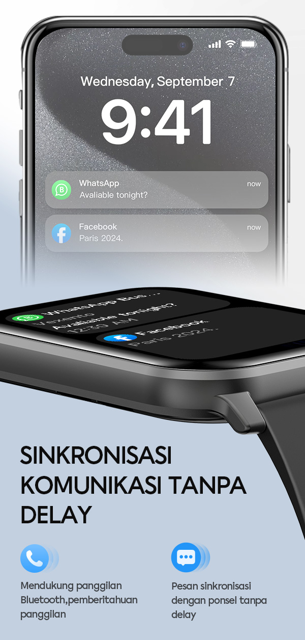 - Fitur notifikasi pintar untuk panggilan, pesan, dan aplikasi sosial langsung di pergelangan tangan.