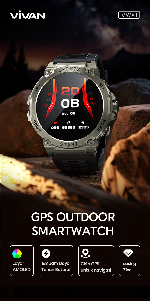 - Smart Watch VIVAN VWX1 Titanium dengan layar AMOLED 1.43 inci, tampilan lebih tajam, warna lebih hidup, dan respons sentuhan halus.