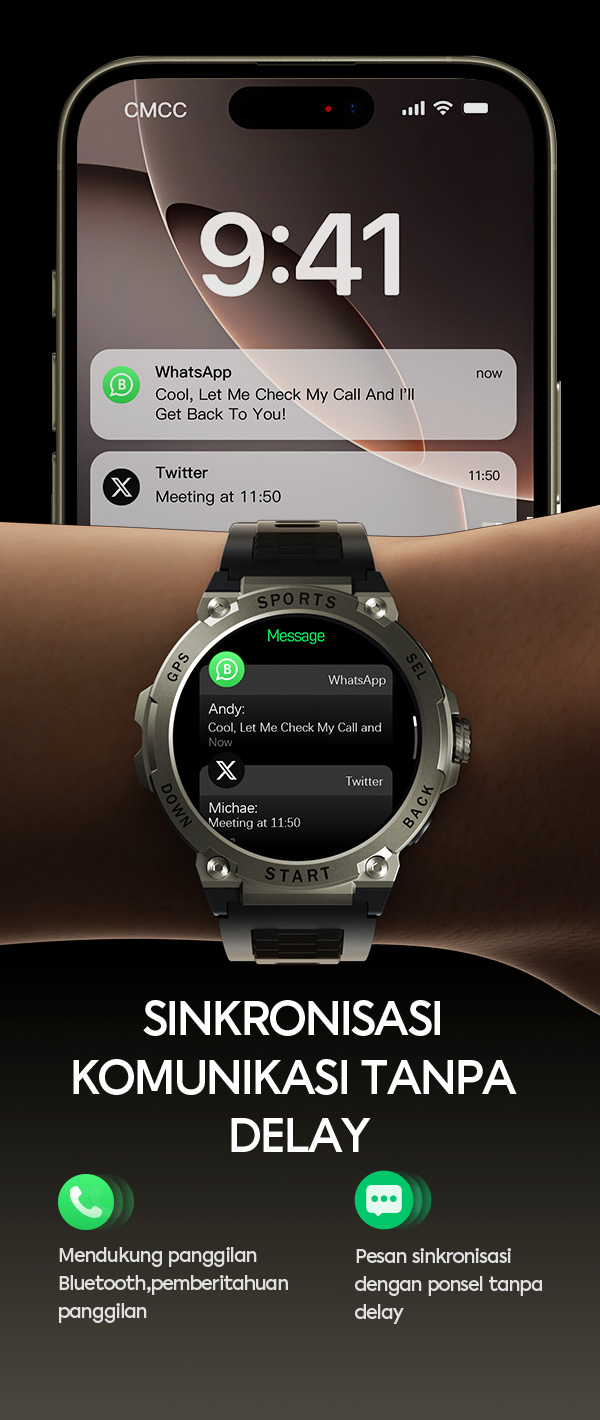 - Fitur notifikasi pintar untuk panggilan, pesan, dan aplikasi sosial langsung di pergelangan tangan.